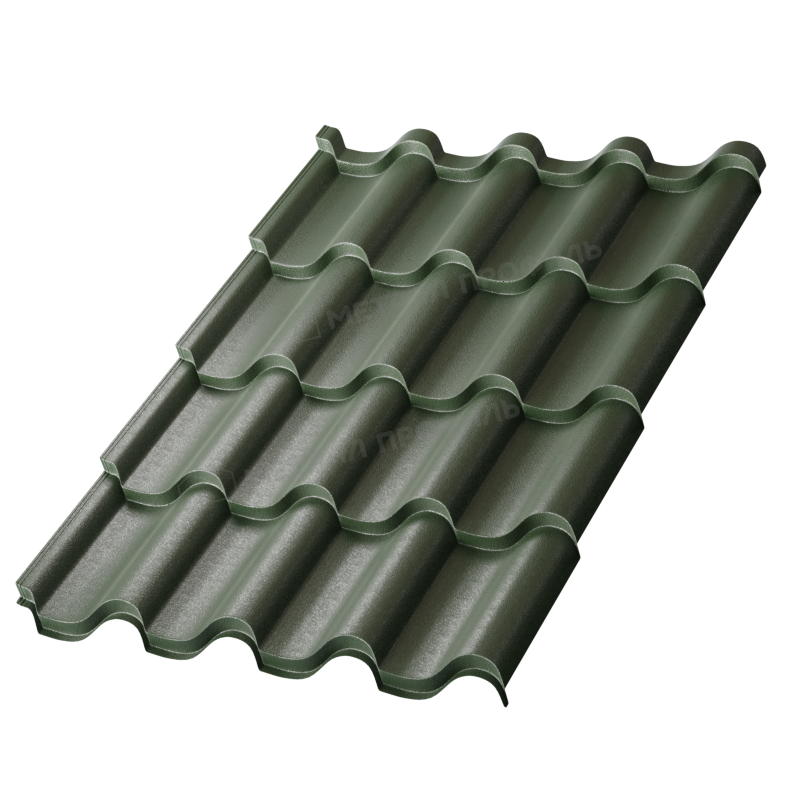 Покрытие VikingMP® — это инновационный полимерный слой на основе полиэстера с матовой текстурой, разработанный для повышения защитных свойств металлочерепицы. Оно наносится на стальную основу толщиной 0,45 мм и включает в себя цинковое покрытие для предотвращения коррозии. Цвет RAL 6007 (бутылочно-зеленый) придает материалу естественный оттенок, гармонирующий с природным ландшафтом. Этот слой устойчив к выцветанию под воздействием солнца, а также к царапинам и загрязнениям. Благодаря специальной формуле, покрытие сохраняет свои свойства в широком диапазоне температур от -50°C до +80°C, что делает его подходящим для различных климатических зон.